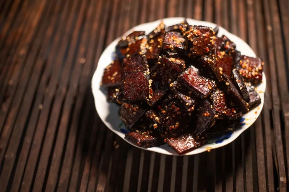 平江酱干始称长寿酱干,亮、鲜、嫩、咸、辣、甜,香气四溢,吃在口中,松脆耐嚼,开胃生津,口感独特,是湖南平江县长寿镇的传统风味特产。据《平江县志》记载:清康熙年间,长寿酱干被列为“宫廷贡品”。