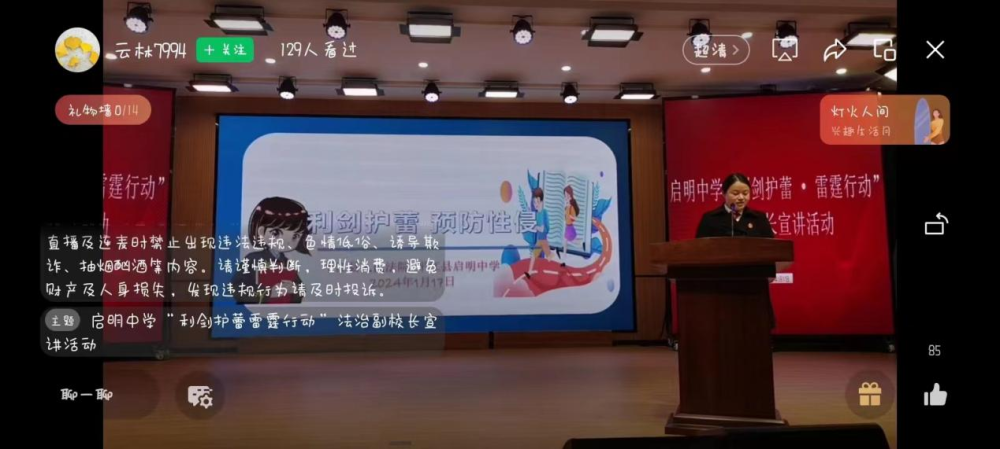 未成年人是祖国的未来、民族的希望,为进一步加强未成年人预防性侵害教育,全力护航未成年人健康成长,1月17日,县人民法院法官来到启明中学通过网络云直播的形式,结合真实案例,用贴近学生们的语言和表达方式,为中学生们上了一堂生动的法治教育课。启明中学全校五千余名师生通过直播观看了此次讲座。