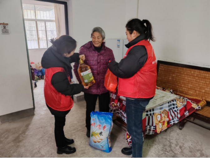 活动中,社区党总支书记罗建国带领社区工作人员和志愿者通过分组入户、走访慰问的方式,为辖区内60余户特殊人群家庭送去慰问金及米、肉、油等生活必需品。每到一户,志愿者们都亲切得与慰问对象拉起家常,详细询问他们的健康状况、生活现状和家庭收入等情况,并叮嘱他们注意冬季保暖、出行安全及取暖用火用电安全,把最真诚的问候、最深情的祝福送入居民心田。家住绿池小区的汪奶奶年近八十,因丈夫离世,自己便常年与患有抑郁症的五十多岁的儿子依靠低保维持基本生活。志愿者临走时,腿脚不便的汪奶奶颤抖着身子送客并高兴地说道:“你们太好了,感谢社区的关心和帮助,感谢党和政府惦记着我们!”