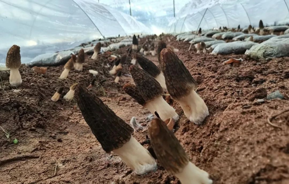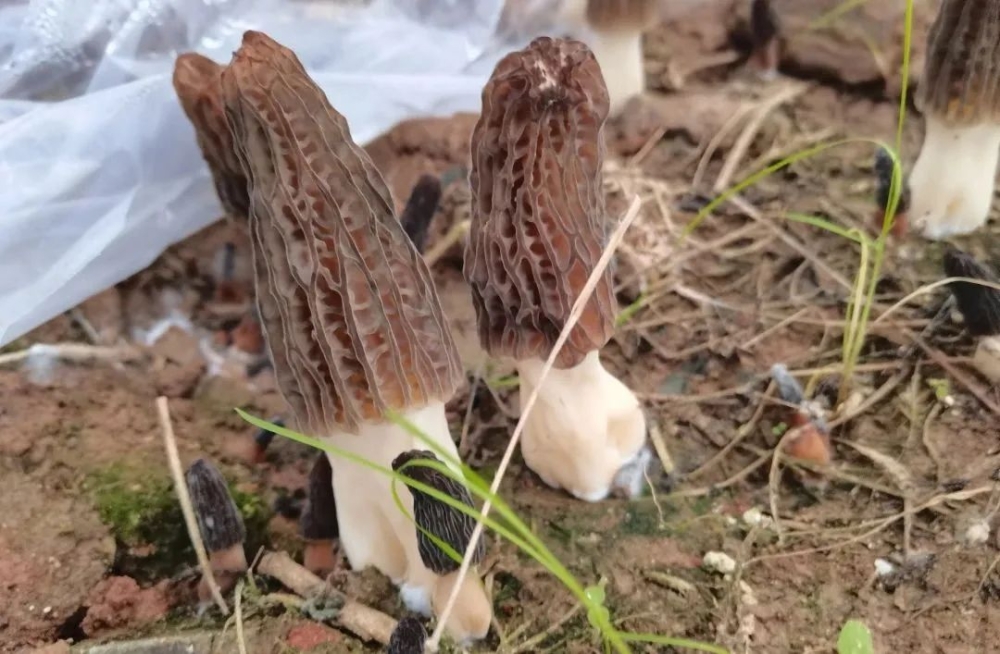 当天,阳光灿烂,成片的黑色大棚格外引人注目。走进棚内,一片生机盎然,羊肚菌撑着一把“褐色小伞”,如雨后春笋破土而出,错落有致地盛开在菌垄上,散发着菌子独特的芳香。李大鹏正在和湖南迪为农业科技有限公司的技术人员对基地进行考察,他专心地听取专业人士在棚内发现的问题和提出的建议。
