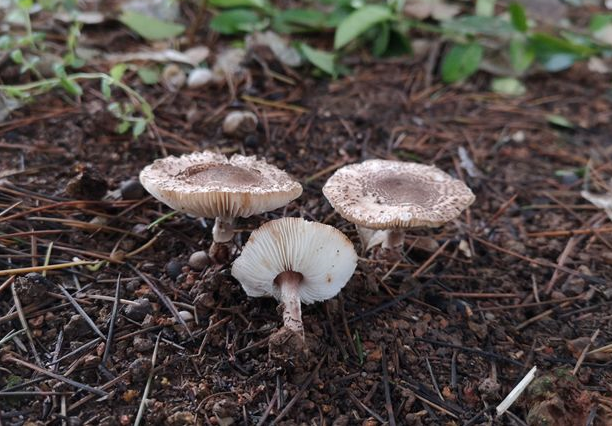 菌盖直径2.5至6厘米,菌环以下常有鳞片,菌环以上颜色较浅,顶部近白色。“小个子,头长草(鳞片),腿长毛(鳞片),松杉树下常见到。”肉褐鳞环柄菇乍一看有点像大家常吃的香菇,虽其貌不扬,但它却含有鹅膏毒素,是名副其实的“小个子大蘑王”。