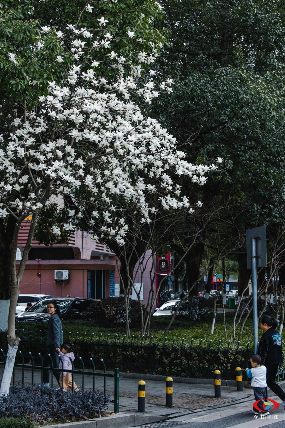 一丛又一丛白的、粉的、紫的,种类繁多、形态各异的苞蕾,在绿化带的树梢上探出脑袋,伴着广场舞队的音乐一同起舞,不时有大人带着小孩的驻足合影,身后锻炼的人们一不小心就入了镜,这场春制造的美丽邂逅,是用生活气息酿成的甜蜜。