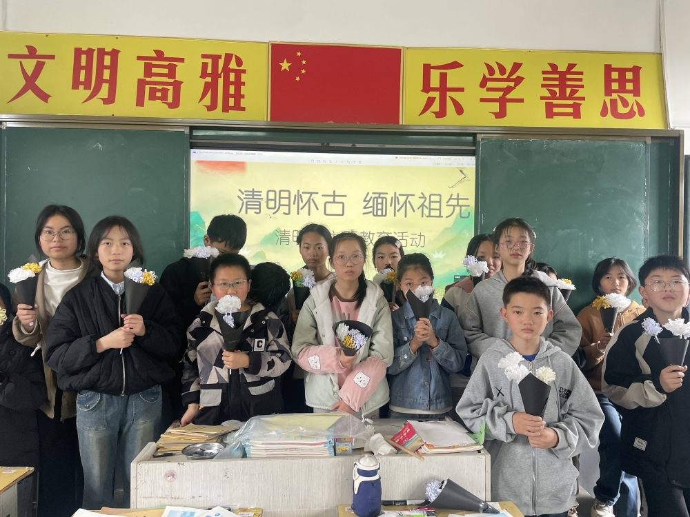 通过讲话让学生们知道了革命先烈们的感人事迹,学生们纷纷表示要继承先烈遗志,奋发学习,立志成才,爱国爱乡。当看到视频中烈士陵园静静耸立的烈士纪念碑时,孩子们没有了往日的喧闹,都静静地肃立着,低头默哀,缅怀革命先烈们的丰功伟绩,并献上了制作的手工菊花,寄托他们的哀思。