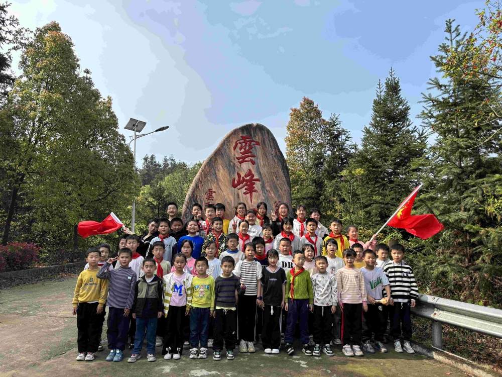 在该校9名老师和10多名家长志愿者的带领下,孩子们兴高采烈地从学校出发了。他们情绪高昂,沿途赏赏美景,哼哼小曲,9时30分就到达云圣山顶。看到雕刻着“云峰胜景”“云圣山欢迎你”字样的大石头,孩子们全都变得更加兴奋起来,奋力冲上前去。
