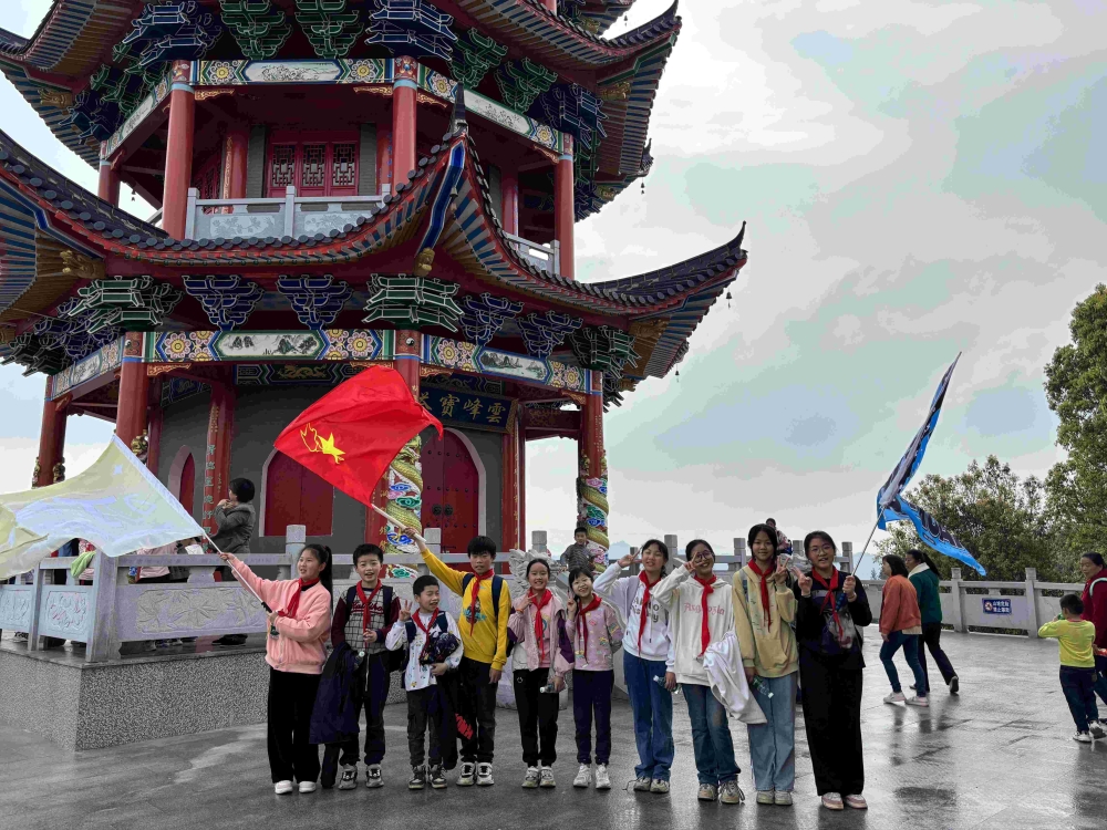 云圣山山顶,那雕栏画栋的亭子、庄严雄伟的大殿,让孩子们产生不虚此行的感受。站在山顶,望着周边的景色,孩子们欢呼雀跃。他们在山顶分年级玩起了各种各样的游戏,开心得不得了。