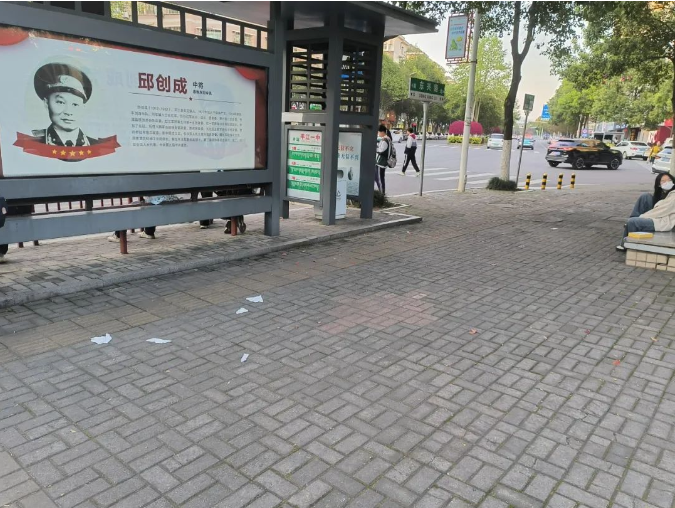 3月29日,在平江二中门口道路两旁的绿化带、公交车站台也有不少饮料瓶、卫生纸等零碎垃圾。