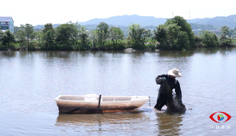 5月14日,在伍市镇普庆村的稻虾养殖基地,头戴草帽、身着水裤的养殖户李均正在水中熟练地抛取虾笼,不一会一只只色泽鲜亮的小龙虾便落入船中。