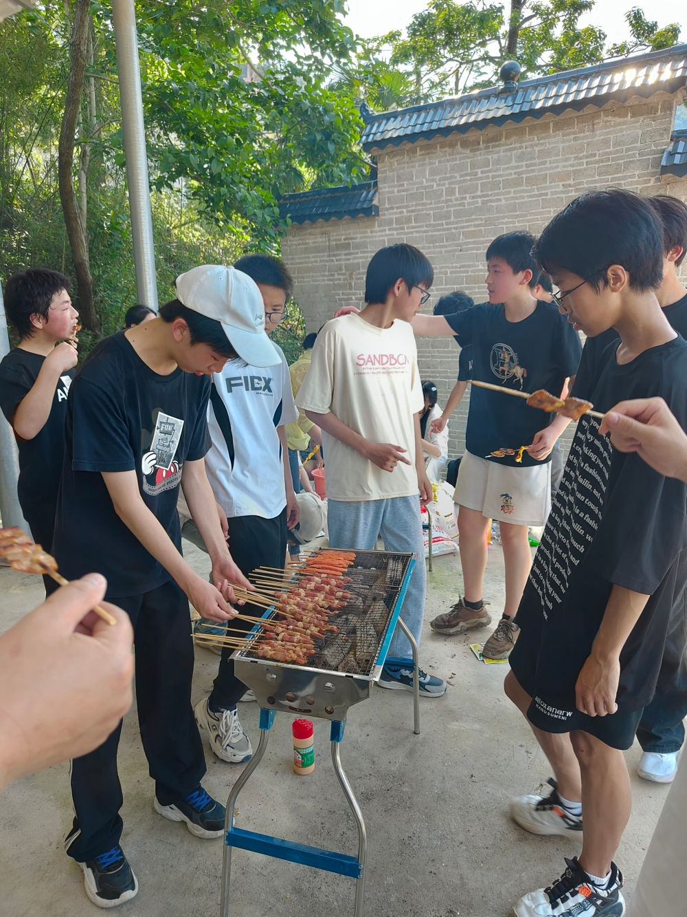 食物的品种多种多样,有茄子、辣椒、玉米、鸡腿、面筋、牛肉串、羊肉串、火腿肠、韭菜等,荤素结合。孩子们分工合作,烧烤起来有模有样。170班的李俊远先把一整只茄子放在架子上烤着,等到火候差不多了,就用刀子把茄子切开,然后用刷子刷上辣椒、油等调味料,最后再撒上点葱花,色香味俱全,师生们分而食之,别提有多开心了。李明轩戴着一次性手套,负责刷油、辣椒,再加上气温高热,不一会儿,他就变成了一个大花脸。171班的钟财金等人也不甘示弱,在自己班的烧烤阵地大显身手。172班的刘博海看到另外两个班居然没带西瓜,故意抱着西瓜到处炫耀着。师生们吃着自己动手烧烤出来的食物,其乐融融。