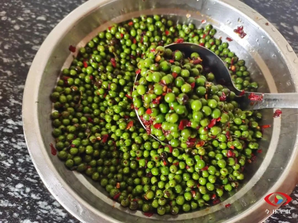 山椒子做菜好吃,平江人都知道。采摘山椒子首先要学会爬树,把结满山椒子的小枝条一根根弄下来,树下当然有同伴接应,负责收集,待大伙心满意足扛着“战利品”回家,摘山椒子又是一门细腻功夫,山椒子个小,一粒粒摘下来费力又费时。好东西当然不是这么容易得到的,鲜的山椒子易变质,往往要经过制作才能较久储存。烧锅起火,待油沸后倒入山椒子,加盐适量,放辣椒粉,瓶装存冰箱冷藏,吃半年没问题。
