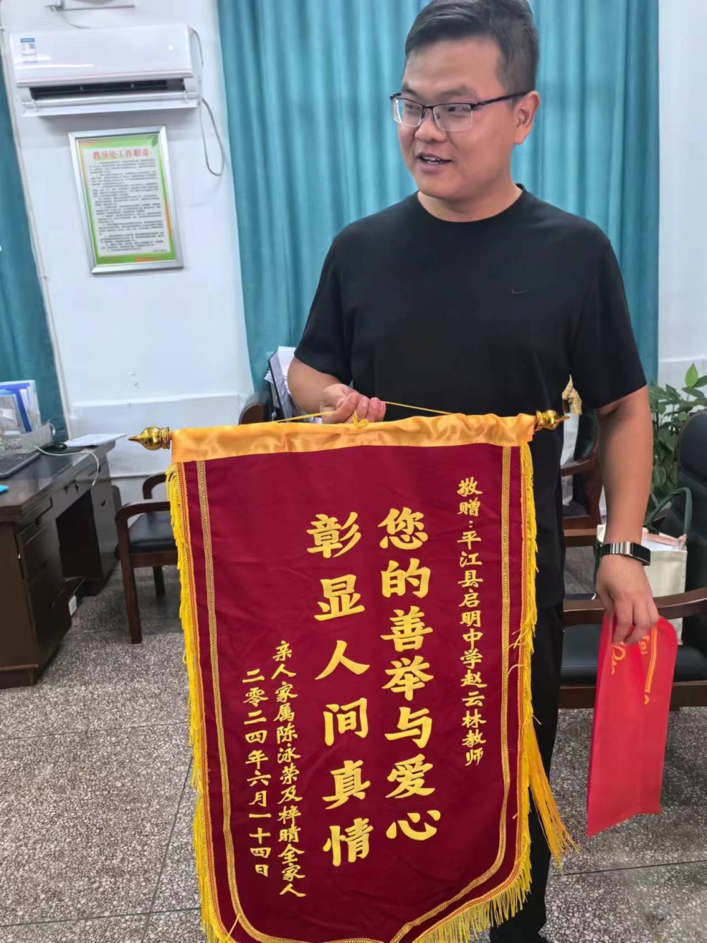 6月17日,一面写有“您的善举与爱心 彰显人间真情”的锦旗送到启明中学德育处副主任赵林层手中。