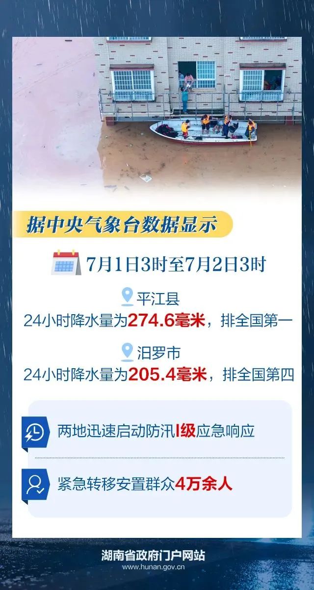 据中央气象台数据显示,7月1日3时至7月2日3时,平江县的24小时降水量为274.6毫米,排名全国第一,迅速启动防汛I级应急响应,紧急转移安置群众4万余人。