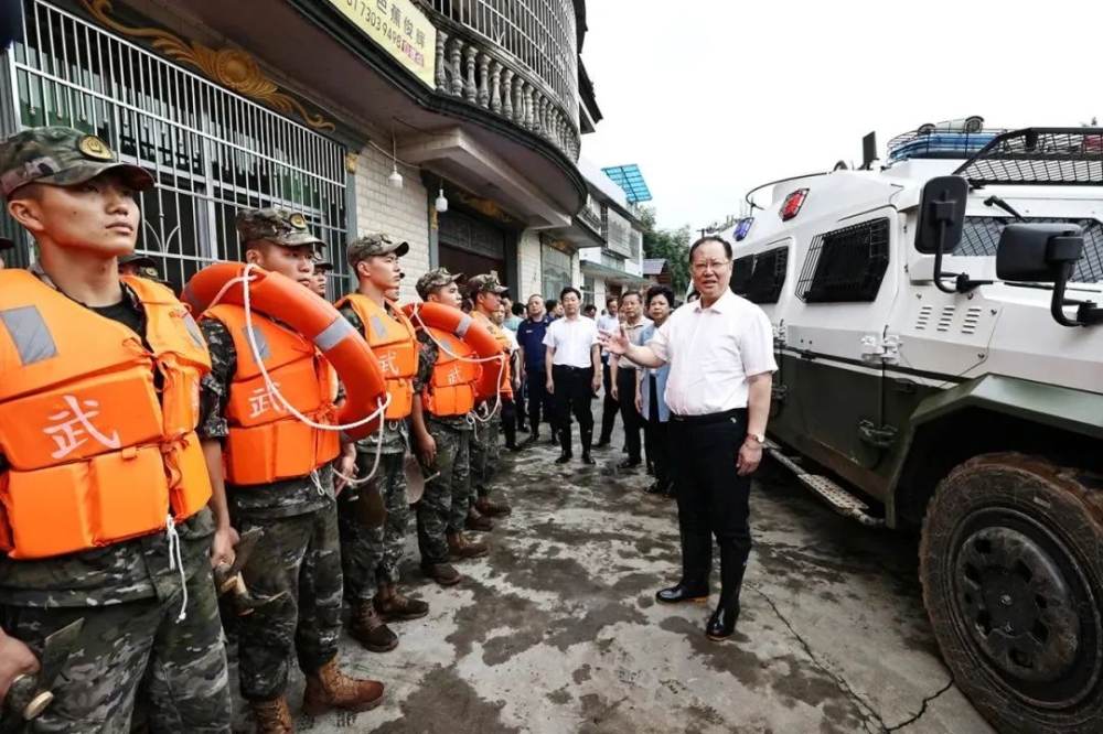 毛伟明一行来到芭蕉村,涉水步行查看损毁路面,了解受灾情况,并代表省委、省政府看望慰问一线武警官兵。他说,当前是防汛抗灾最为关键的时刻。越是关键时刻,越要上下同心、众志成城,排除万险、克服万难,希望大家继续发挥好召之即来、来之能战、战之能胜的思想自觉、政治自觉、行动自觉,以昂扬的斗志,为坚决打赢打好防汛抗灾这场硬仗贡献更多力量。