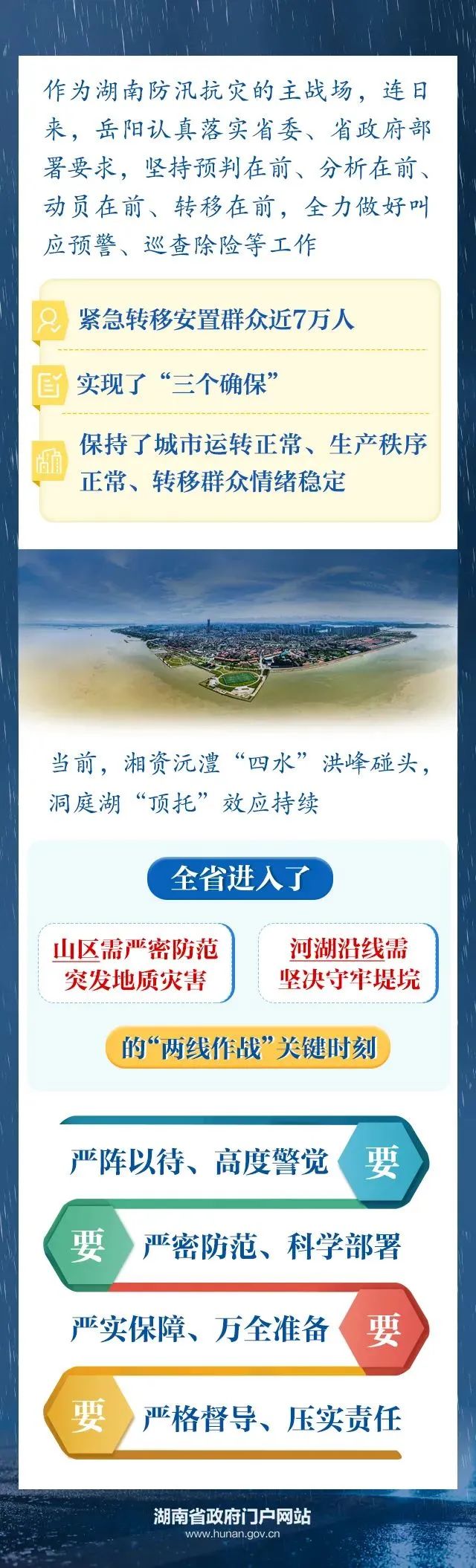 他说,作为湖南防汛抗灾的主战场,连日来,岳阳认真落实省委、省政府部署要求,坚持预判在前、分析在前、动员在前、转移在前,全力做好叫应预警、巡查除险等工作,紧急转移安置群众近7万人,实现了“三个确保”,保持了城市运转正常、生产秩序正常、转移群众情绪稳定。