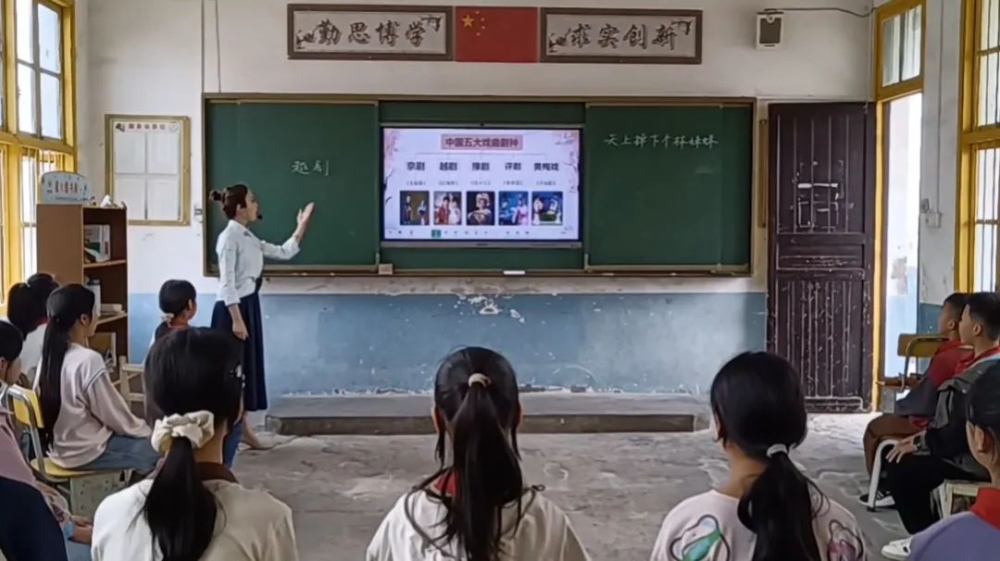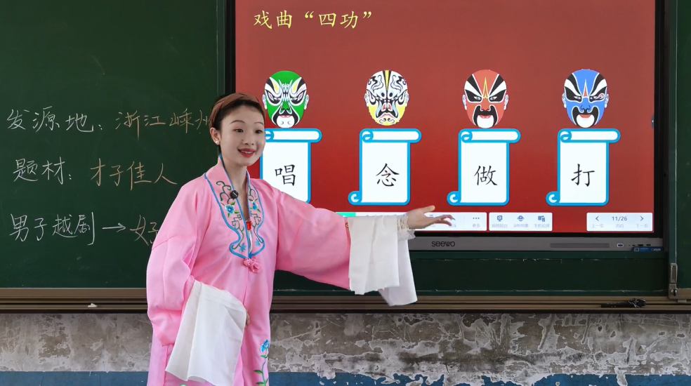 除了常规的课堂时间,陈安琪还充分利用午休、大课间等课余时间,带着孩子们唱歌,保丰小学的校园里常常响起悦耳的童声合唱。看着孩子们上音乐课时专注、期待的眼神,陈安琪萌发了教孩子们唱戏曲,让他们更多地了解中国传统音乐文化的想法。于是,2022年初,她向校长主动请缨,创办戏曲社团。