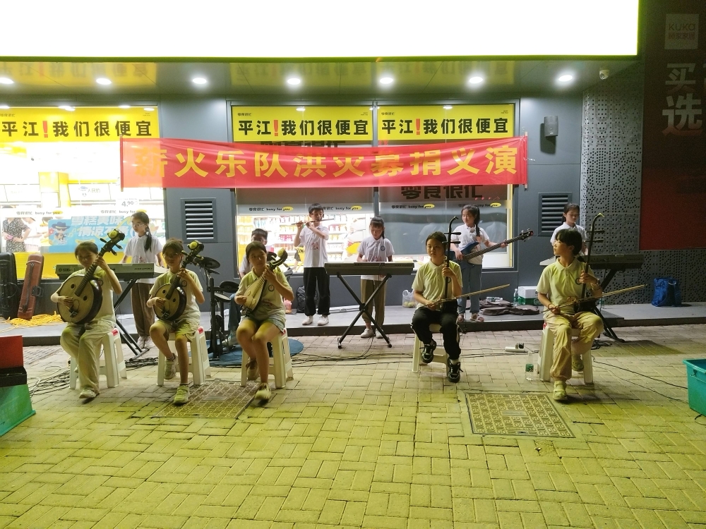 为了告诉人们这是募捐义演,他们还特意制作了一条横幅,上面写着:“薪火乐队、梦想乐队洪灾募捐义演”。