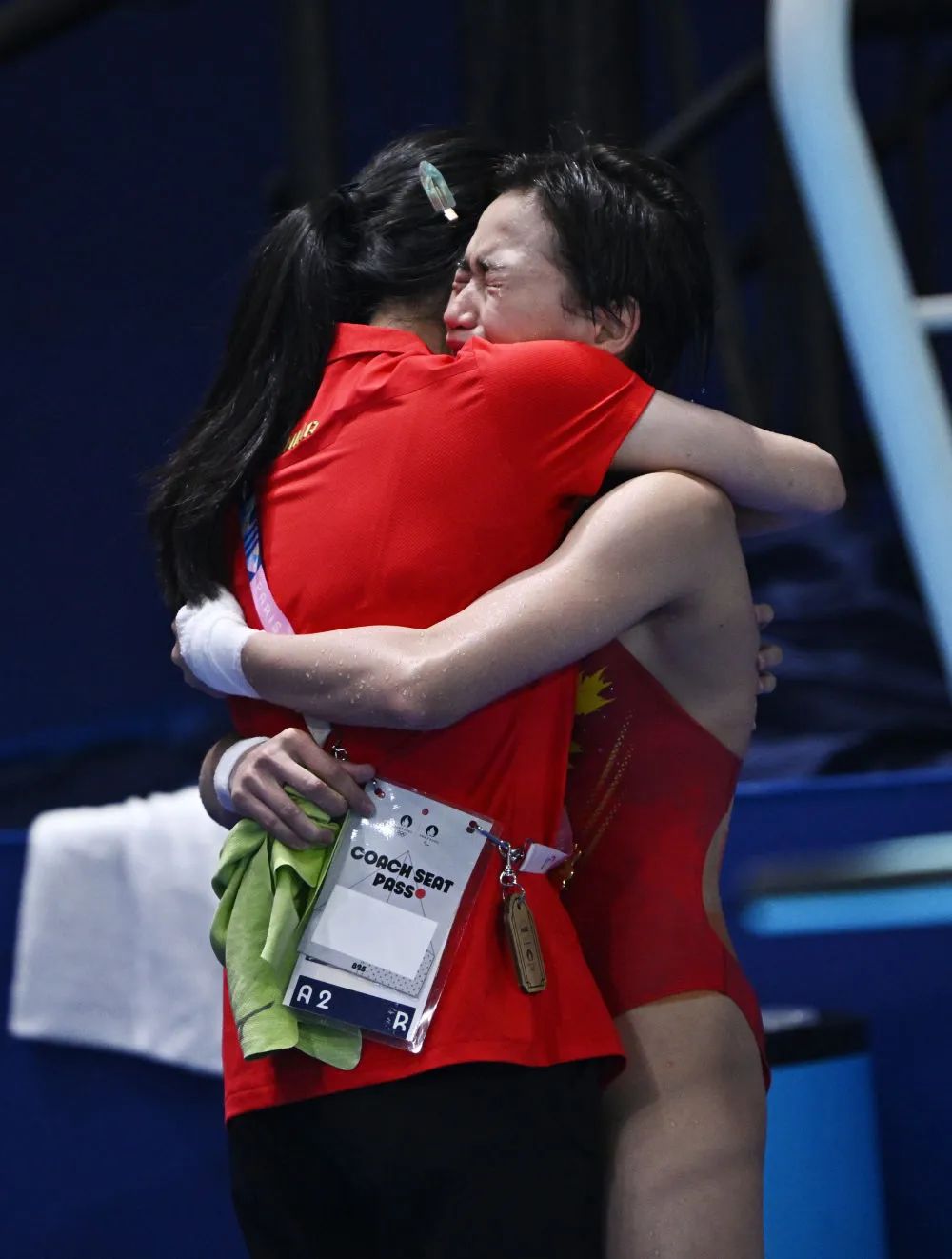 她夺冠后红了眼眶,扑进了教练陈若琳怀里,随后一路小跑去找陈芋汐,两人拥抱在一起。
