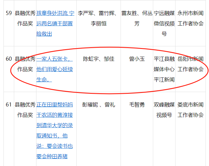 2023年度湖南新闻奖评选结果揭晓,其中,我县融媒体中心报送的《一家人五张卡,他们用爱心延续生命》荣获湖南新闻奖一等奖!