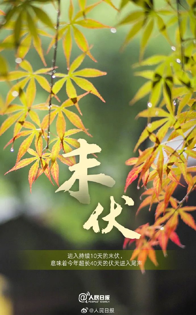 今年末伏为8月14日至23日,超长40天伏天进入尾声。末伏余热未消,很多地区仍处在闷热气候中,依然要注意防暑降温。民间饮食有“头伏饺子二伏面,三伏烙饼摊鸡蛋”的习俗。不要猛吹空调、过度吃冷饮,应起居有节、适量运动。继续加油,一起期待凉爽的金秋吧!