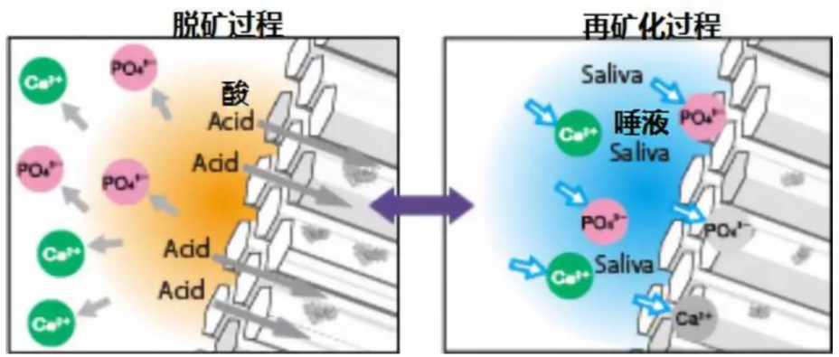 但是,口腔防御机制也有一定自我纠错和修复功能。牙齿长期浸泡在唾液里,唾液中含有大量的钙磷离子(且往往浓度高于牙面),可以随时往牙面上沉积,重新形成新的羟基磷灰石,弥补之前脱矿造成的钙磷损失,形成动态平衡。