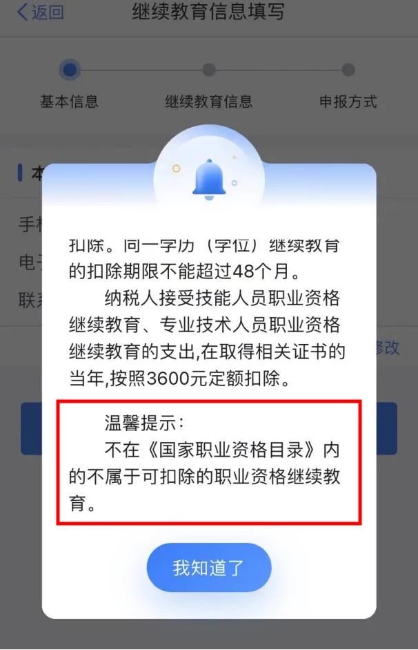 在填报继续教育专项附加扣除时,系统会提示,“不在《国家职业资格目录》内的不属于可扣除的职业资格继续教育”。