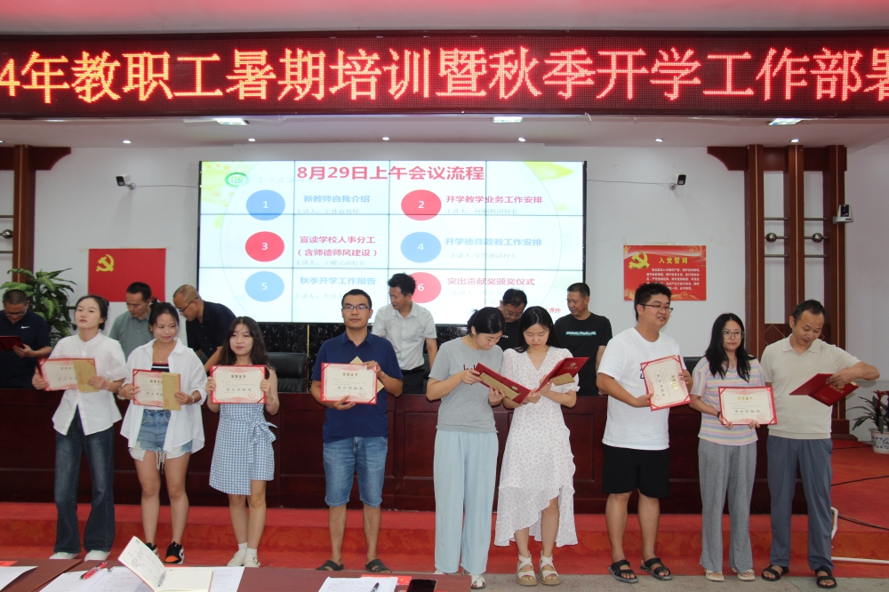 会议由党总支书记陈学究主持。他首先代表学校党政班子向新入职和新调进的18位老师表示热烈的欢迎,并逐人介绍他们的基本情况。传达学习县教育局关于秋季开学工作的基本要求,以及本次大会的筹备情况,并宣布六项议程及会议纪律。