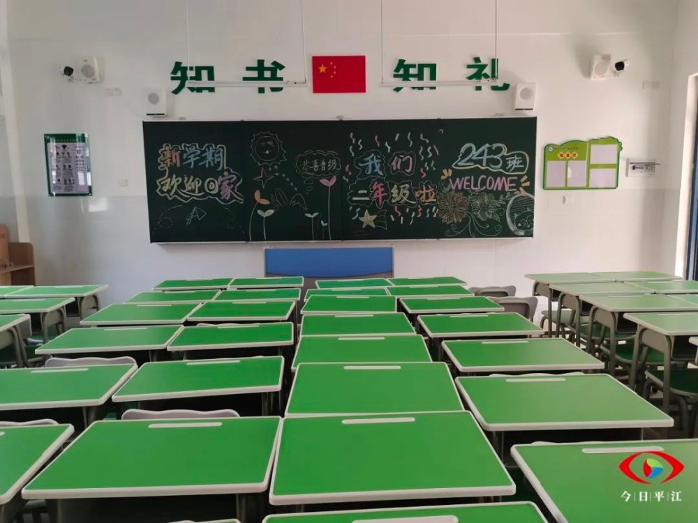 ▲新城学校教室内,全新的课桌椅整齐排列,开学氛围浓厚。