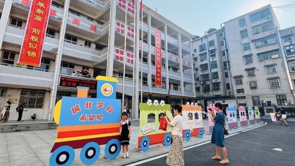 9月2日,城北学校操场上迎面“驶来”一列由一年级驶向未来的“小火车”,孩子们纷纷在所在年级的小火车车厢前打卡拍照,在“星辰大海,共赴未来”“新学期,乘风破浪”的祝福下,以崭新的面貌,开启新学期、新征程。