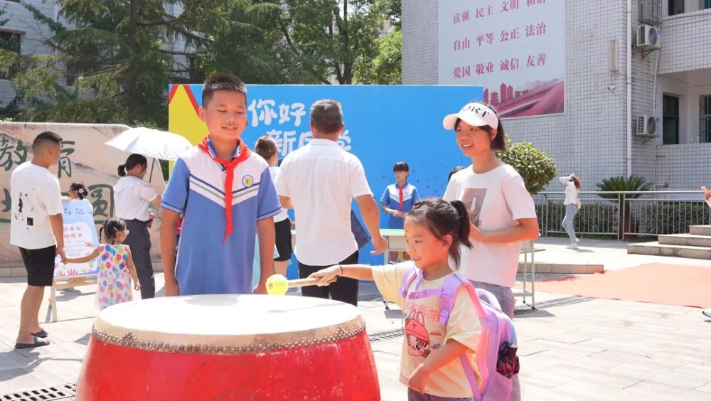 9月2日,新城学校的一年级的新生们在家长的陪同下,用击鼓表明孩子们的志向,开启一年级新生快乐的小学生活。