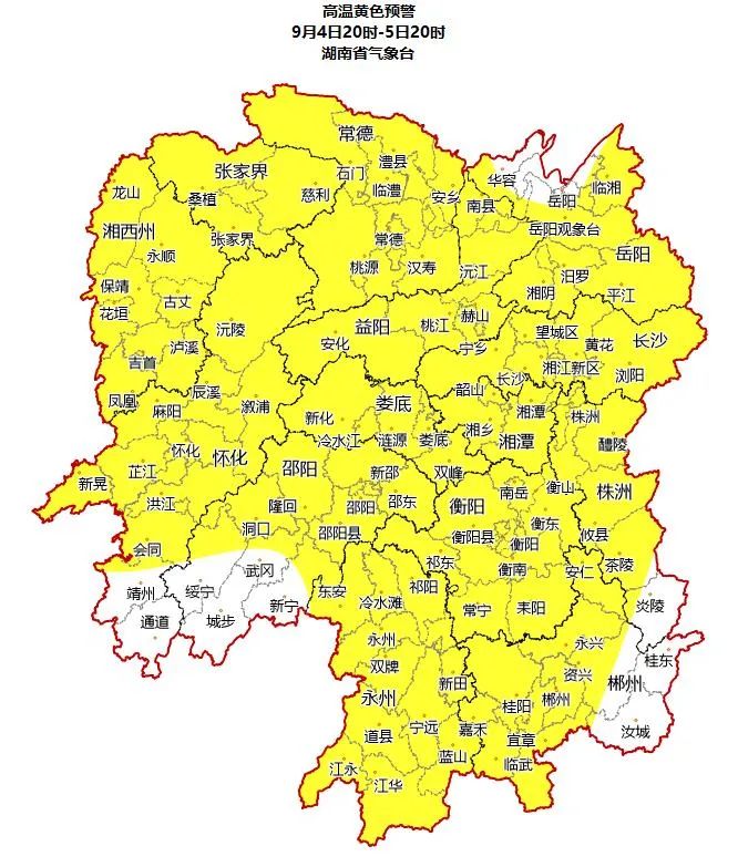 湖南省气象台9月4日16时发布高温黄色预警:预计4日20时至5日20时,全省将出现35℃以上高温,部分地区将达37℃以上,请做好防范。