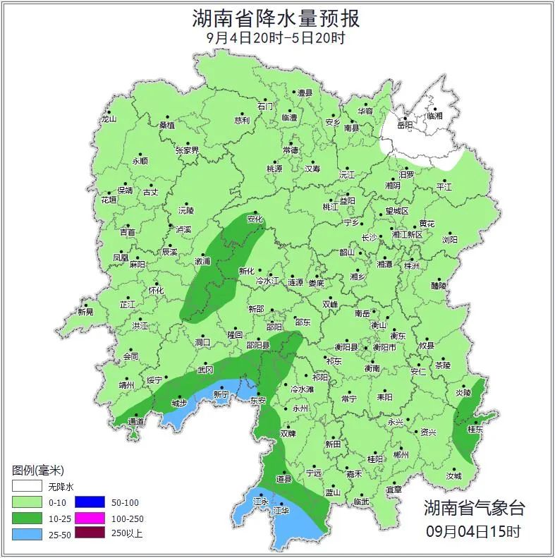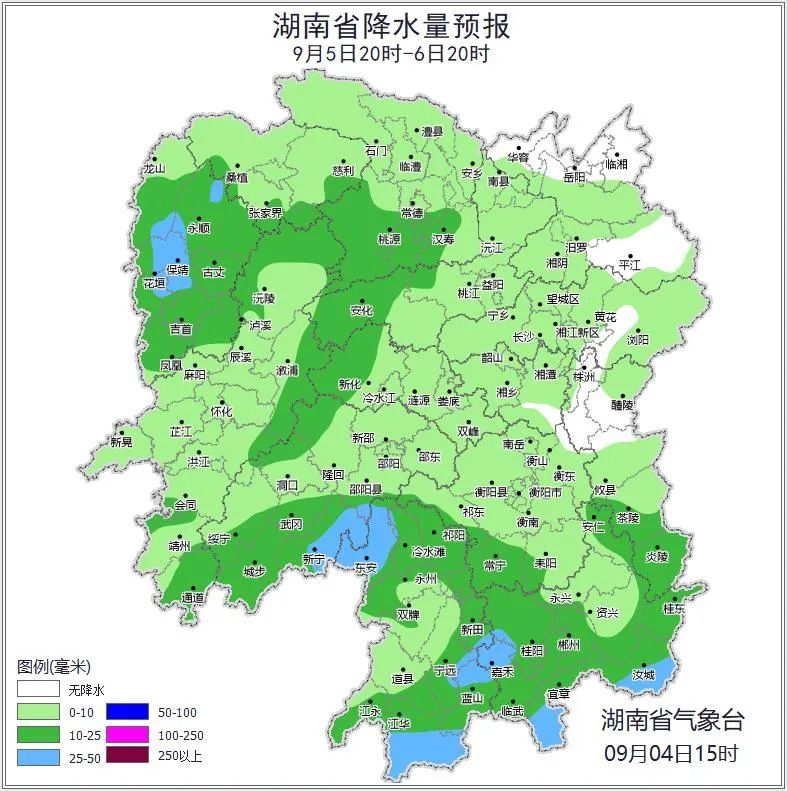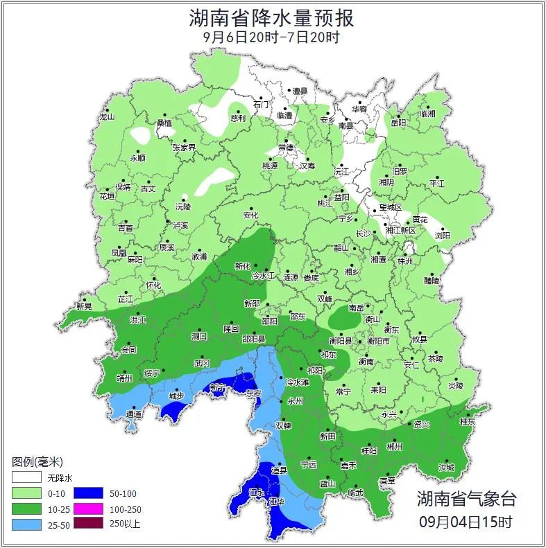 9月6日晚上到9月7日白天,多云,大部分地区有小到中等阵雨或雷阵雨,怀化南部、邵阳南部、永州部分地区大雨,其中永州(道县、东安、江华、江永)、邵阳(城步、新宁)有暴雨;北风3~4级,雷雨时局地阵风7~9级;最高气温湘东36~38℃,其他地区34~36℃;最低气温23~25℃。