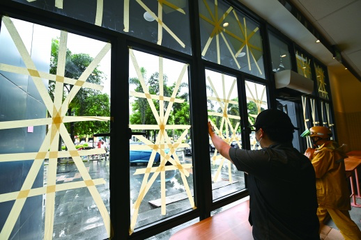 9月5日,海口市一家餐馆的员工加固玻璃窗。台风“摩羯”预计9月6日在海南琼海一带登陆。新华社 图