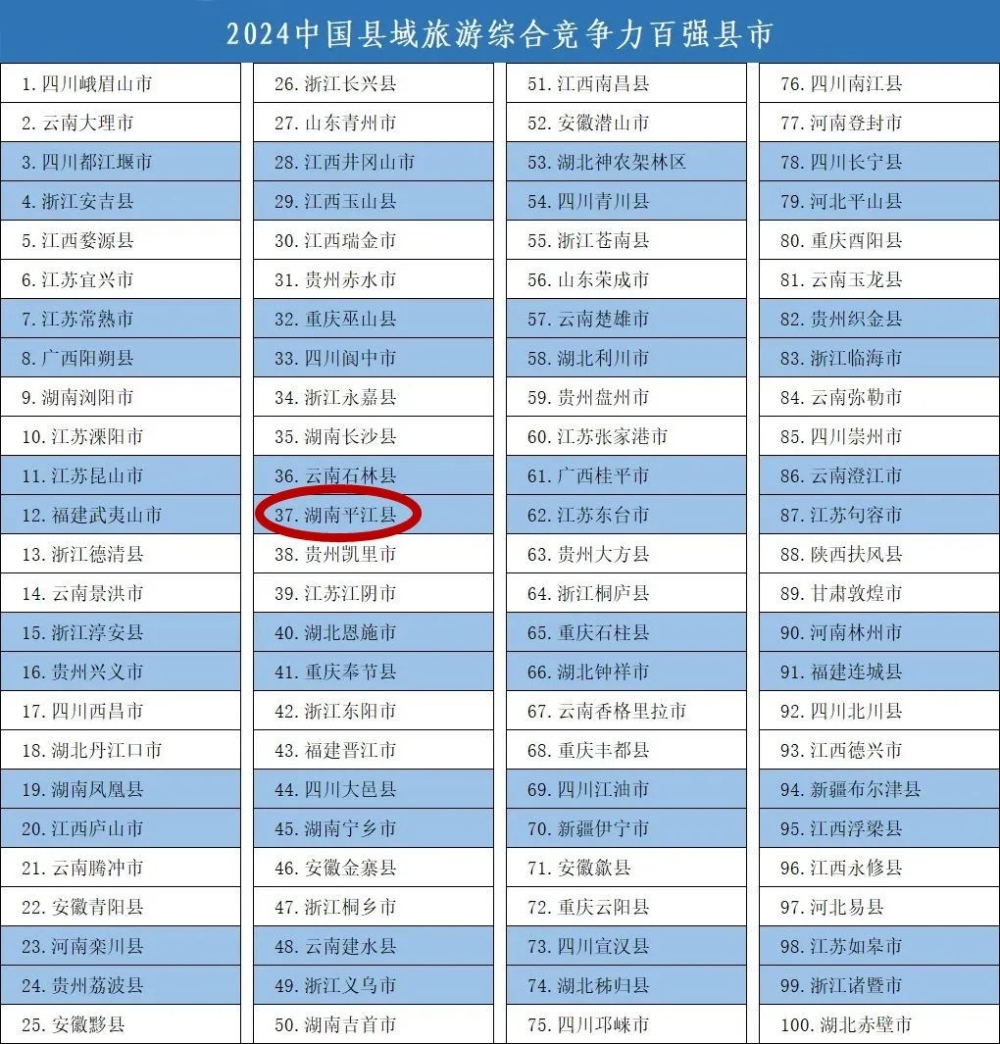 9月19日,竞争力智库,北京中新城市规划设计研究院等机构在北京联合发布《中国县域旅游竞争力报告2024》,揭晓了2024中国县域旅游综合竞争力百强县市,2024中国县域旅游发展潜力百强县市,2024中国市辖区旅游综合竞争力百强区名单。平江县上榜2024中国县域旅游综合竞争力百强县市,排名37名。从2018年开始,平江县已连续七年上榜。