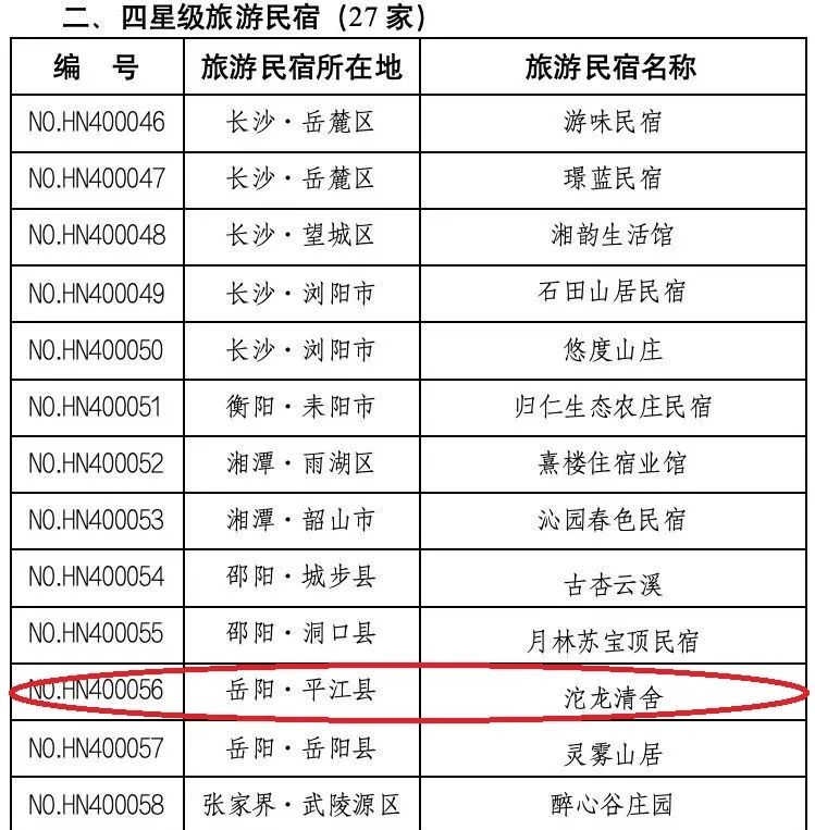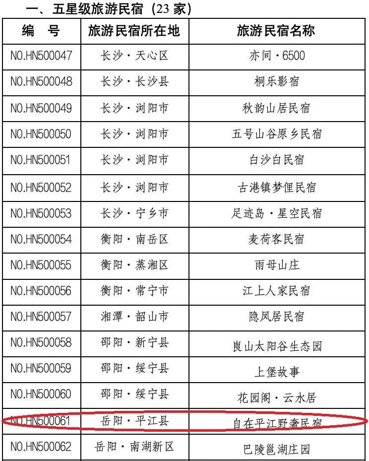 近日,湖南省旅游民宿等级评定委员会发布关于确定2024年湖南省五、四星级旅游民宿的公告,确定23家湖南省五星级旅游民宿、27家湖南省四星级旅游民宿,其中平江两家民宿上榜,分别是自在平江野奢民宿、沱龙清舍。
