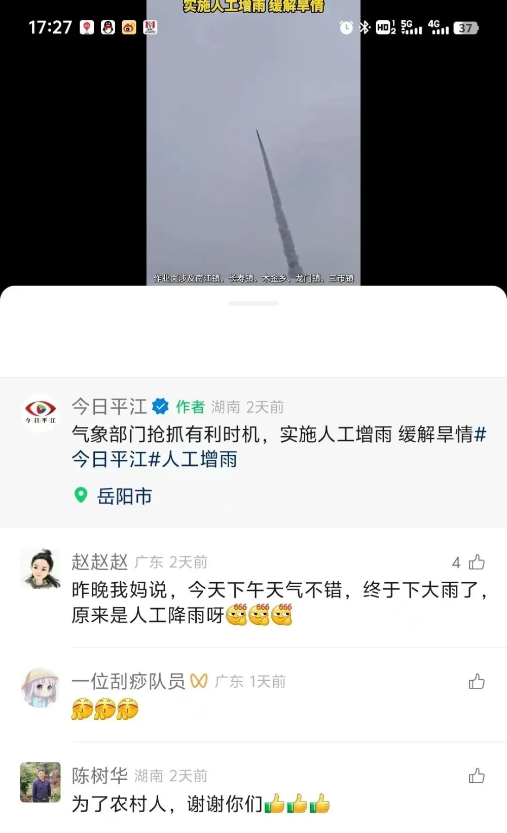 平江终于下雨了!10月14日起,县气象局抓住有利机会,在南江镇、长寿镇、木金镇、龙门镇、三市镇等多地组织开展人工增雨作业。在自然降水与人工增雨的双重作用下,作业区域内降下了小到中雨。据县气象局统计数据:10月14日至17日,我县平均降水19.5毫米,累计超过10毫米的36个站点,超过20毫米的17个站点,最大降水黄金堰水库36.3毫米,其次龙门30.8毫米、长寿30.3毫米。