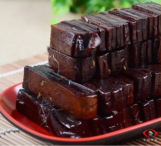 ▲清朝咸丰七年,在长寿街开冷酒镇的何维丰,经过反复试验不断改进配方,用黄豆作为原料生产小块豆腐,佐以鸡汁、五香、肉桂、植物油等配料,经过蒸煮、木炭烘干等工序制成酱干,一经传播,风行全国,闻名于世,成为清朝皇上钦点食品。