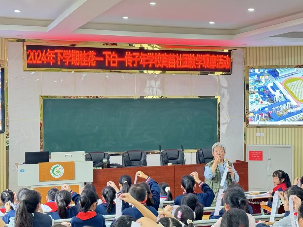 活动在桂花学校的合班教室进行,随着该校副校长艾交平致欢迎词,活动拉开序幕。一头白发,67岁的张伟给孩子们带来了名为《陶笛演奏“双基”内容和教材课程乐曲》的陶笛课。他从持笛姿势、呼吸方法、基础指法及简单曲目演奏等方面普及陶笛文化和提升孩子们陶笛的演奏技巧。
