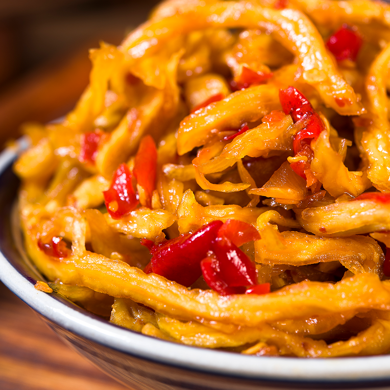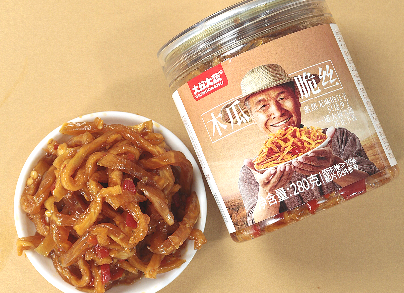鑫湘食主打产品是小罐装木瓜丝。香辣脆爽的酱菜,用手工精选的新鲜青木瓜刨成丝,经过自然晾晒和泡发,再加入鑫湘食秘制剁辣椒酱等各种调料腌制而成。它外表金黄,入口鲜香,辣意上头,夹馒头,拌米饭都是一绝。这是湖南人最爱的腌菜之一,也是漂泊在外湖南人最怀念的味道。