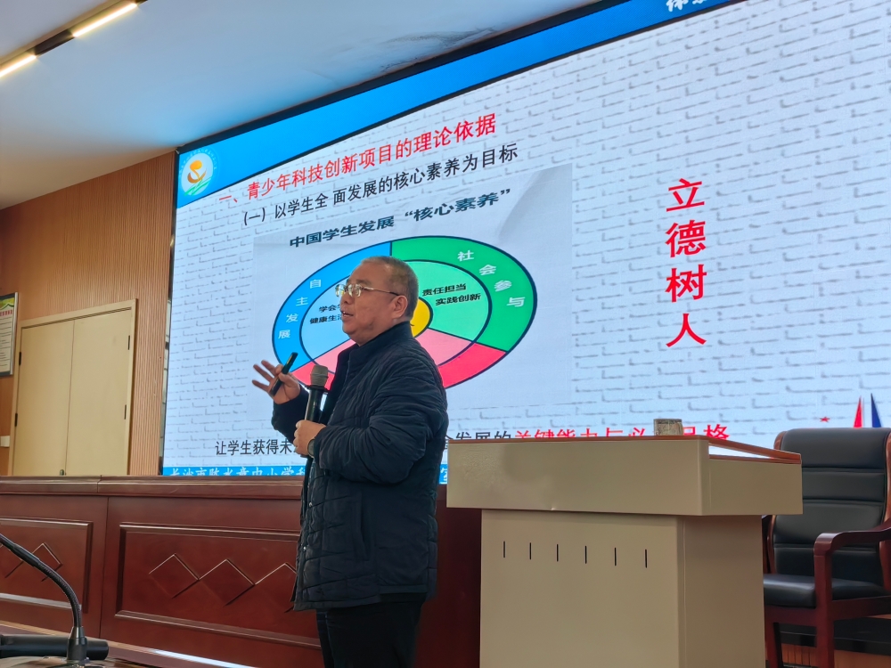 长沙市长郡芙蓉中学科创特色教育中心主任、长沙市中小学科技创新名师工作室首席名师陈水章授课《科学教育之如何冲击全国青少年科技创新大赛国赛》。陈水章介绍了全国青少年科技创新大赛的科技创新项目设计与实施的依据,提出要以学生全面发展的核心素养为目标,以青少年科技创新大赛主题为抓手,培养学生获得未来发展和适宜未来社会发展的关键能力与必备品格;具体讲解了青少年科技创新项目设计与实施的方法步骤,通过对《车流自控双模交通信号装置》等案例的解析,强调在真实情境中提出问题,打破常规思维,并通过创新应用解决实际问题,做到“无情境,不创新”;对青少年科技创新大赛的准备流程、成果呈现、创新点提炼,以及研究报告的撰写要求进行了详细的解说,让老师们对科技创新大赛有了更深刻的了解,也对如何辅导优秀的学生作品有了清晰的认识。