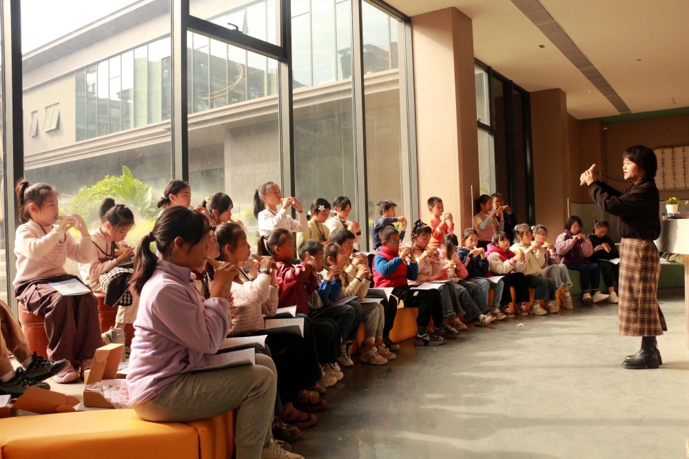 12月14日上午9时开始,位于江屿城营销中心一楼的“阅读小屋&四点半学堂”传来一阵阵悦耳的陶笛声,20余名萌娃在桂花学校音乐老师何晓燕的指导下,开心地吹奏起陶笛。阳光透过玻璃墙照在孩子们欢乐的小脸上,这已经是他们跟着何晓燕免费学习陶笛的第四个周六了。