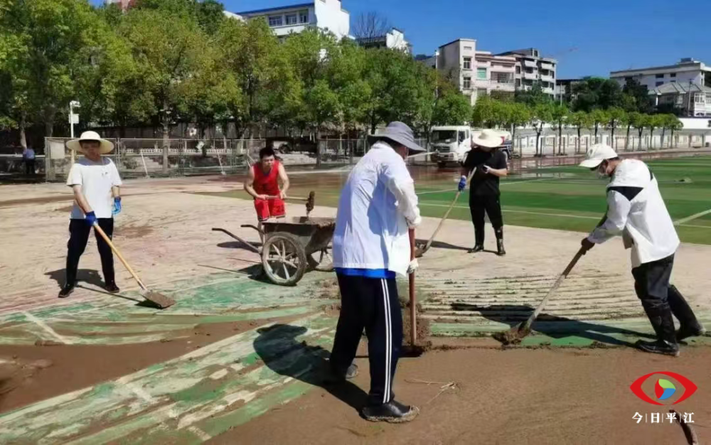 ▲7月30日现场,为确保如期顺利开学,启明中学教职工、志愿者在清理操场淤泥。
