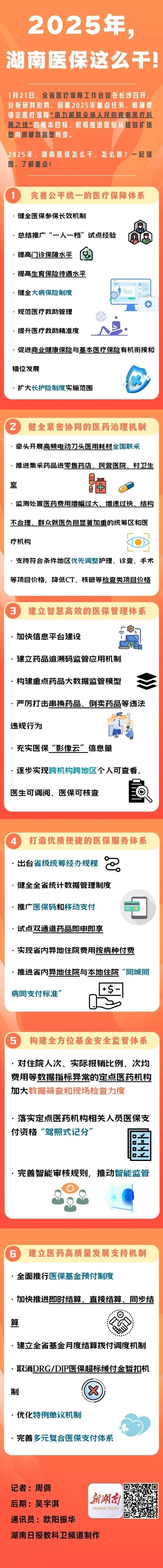 2025年,我省将完善公平统一的医疗保障体系,健全医保参保长效机制,总结推广“一人一档”试点经验,提高门诊保障水平,提高生育保险待遇水平,健全大病保险制度,规范医疗救助管理,提升医疗救助精准度,促进商业健康保险与基本医疗保险有机衔接和错位发展。