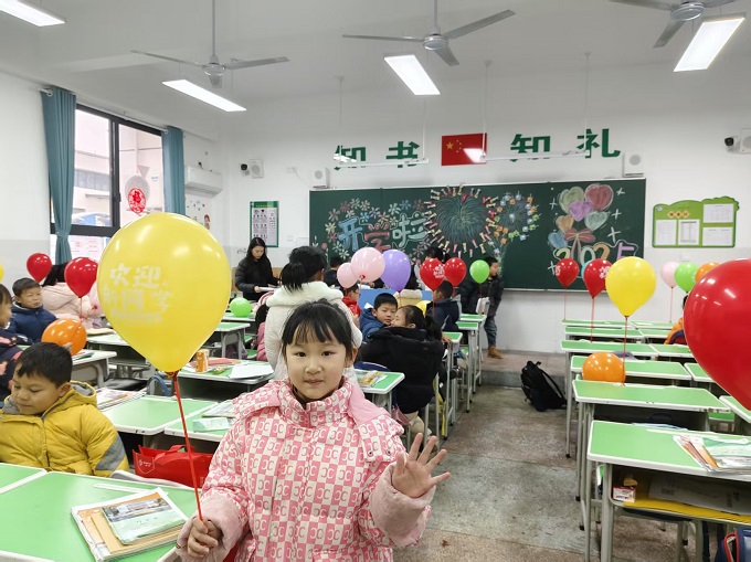 教室里,老师们以满满的巧思与爱意,利用有限的空间,发挥无限的想象力,为孩子们打造了一场仪式感十足的开学盛宴。映入眼帘的是整齐列队的课桌,黑板上,迎新年的创意标语灵动跃动,缀以蜿蜒的蛇形彩绘与祥云图案,寓意智慧与好运绵延相伴。窗边垂挂的流苏灯笼、桌面精巧的剪纸,还有写上“平安·喜乐”祝福卡,色彩斑斓的彩带气球,让教室每一处都流淌着温暖的新年气息。