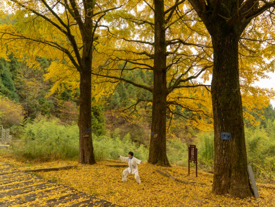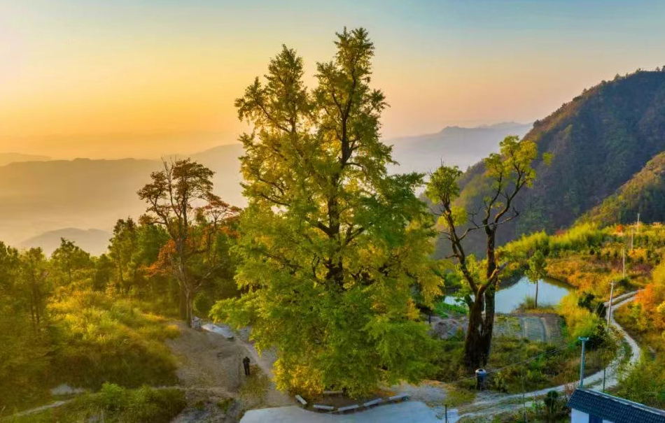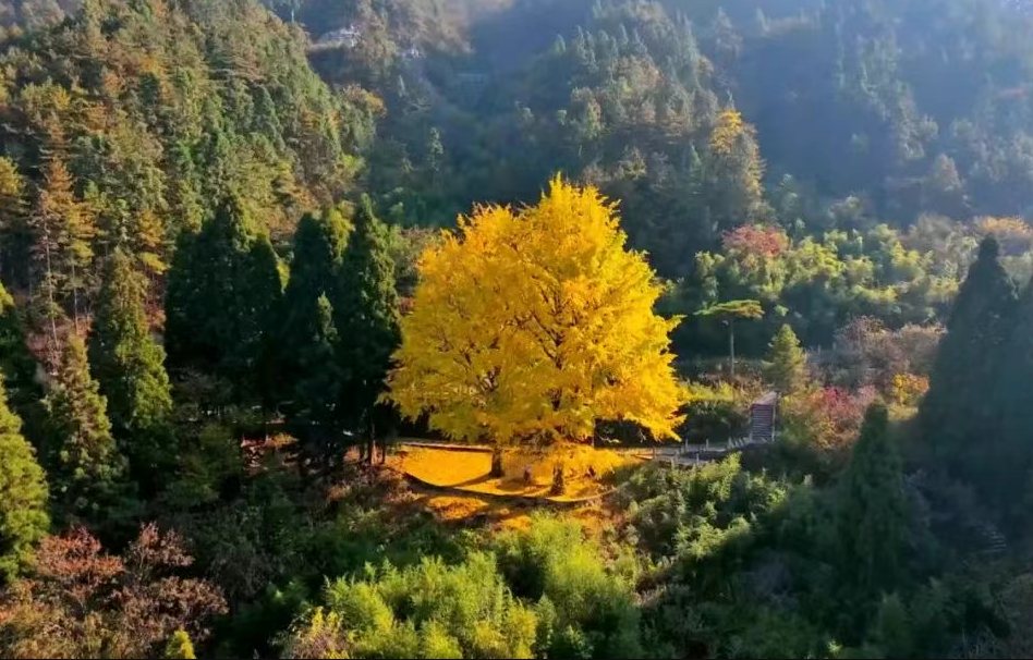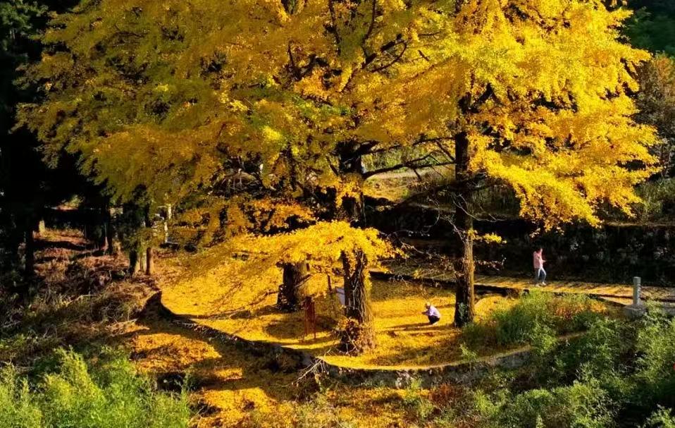 在天岳幕阜山天乐堂,三棵800多岁的“银杏三姐妹”静静伫立。遥想当年,种子或许借风之力,或许随飞鸟迁徙,幸运地落定这片山谷。这里土壤肥沃,犹如天然的养分库,为种子的萌发与成长源源不断地输送营养;四周高山环绕,巧妙地阻挡了凛冽寒风与狂风暴雨的侵袭,营造出温暖、宁静的小气候。在大自然这位顶级“园艺师”的精心呵护下,小银杏历经数百年风雨,长成如今需数人合抱的参天巨木。金秋时节,金黄的银杏叶如点点繁星飘落,绘就平江秋日里最醉人的画卷。