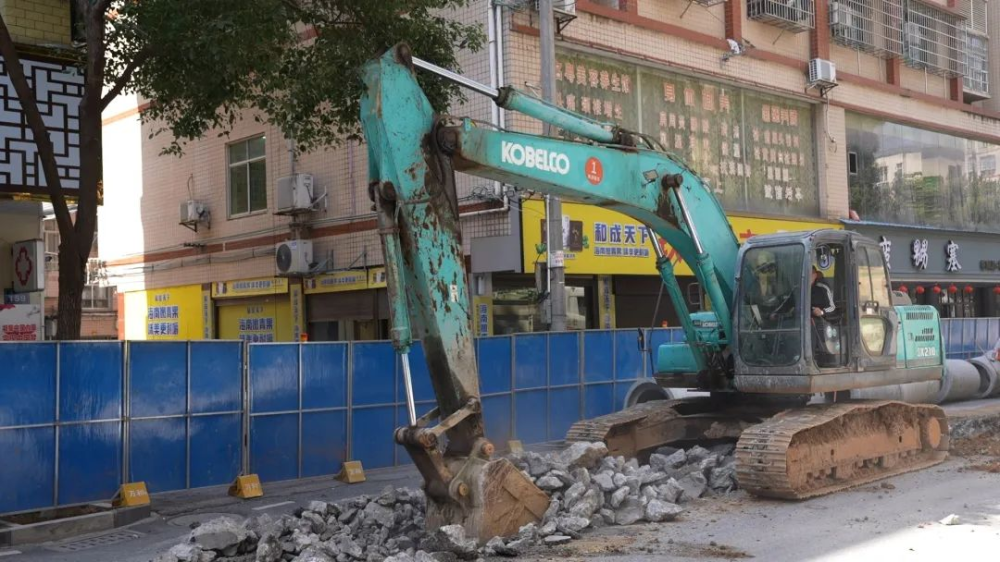 围挡内,挖土机正在紧张作业,路面被挖开道道“口子”,工人们则正忙着开挖沟渠、铺设焊接管道。