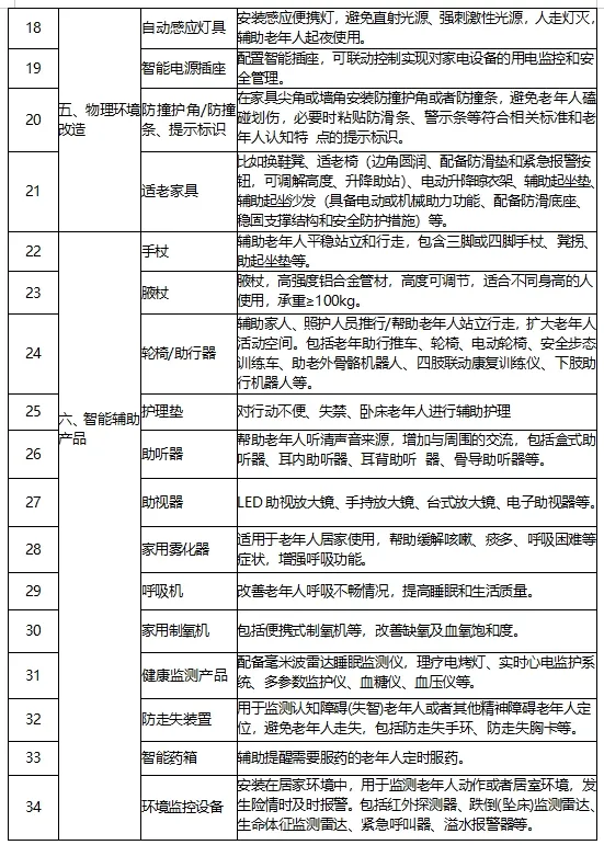 (三)补贴范围。包含地面和门改造、卧室改造、如厕洗浴设备改造、厨房设备改造、物理环境改造、智能辅助产品6大类34小类商品(具体清单详见附件1)。