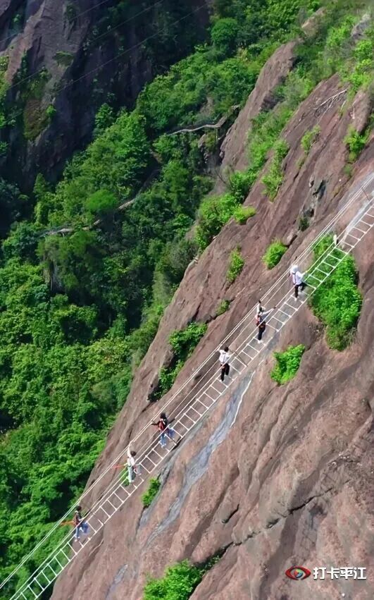 悬挂于海拔520米绝壁之上的绝壁天梯,全长300米,垂直落差达260米,是湖南首条悬挂式高空阶梯。在专业教练指导下打卡天梯,耳畔山风呼啸,便可将眼前“天下第一寨”的壮丽景色尽收眼底。