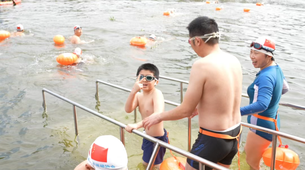 不远处,10岁的卢弘扬正有模有样地摆动双臂做热身。父亲在一旁鼓劲道:“能下水,今天就是成功了。”在爸爸的贴身守护下,这位年纪最小的选手勇敢地完成了挑战,上岸时兴奋地对着镜头比出胜利的“V”字。