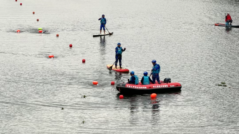 在选手们劈波斩浪的同时,江面上,还有一群蓝天救援队队员立于艇上,目光如炬,紧盯着每一位劈波前行的泳者,筑起一道移动的安全防线。