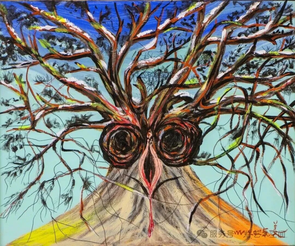 姜维并非农民出身,却以特邀画家身份出现在本届农民画展。他的作品里,有翻滚的云涛、燃烧的田野,也有交织的渴望与挣扎——这与他的个人经历密不可分。在过去的二十年里,他一直与“精神分裂症”共处,绘画成了他与世界对话、与自我和解的最重要方式。