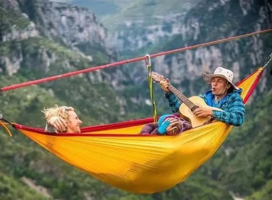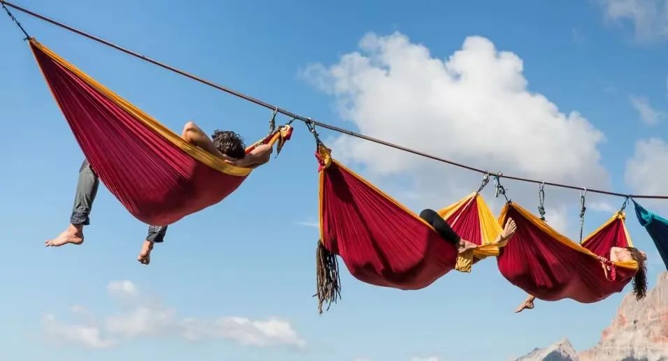 高空扁带表演除了,站着的花式表演,我们还有躺着的花式表演。悬空吊床,横跨峡谷如万丈深渊,最牛逼的不是小心翼翼,而是这般淡定、还自得其乐。除了聊天、唱歌,我们还有才艺秀,敬请期待!